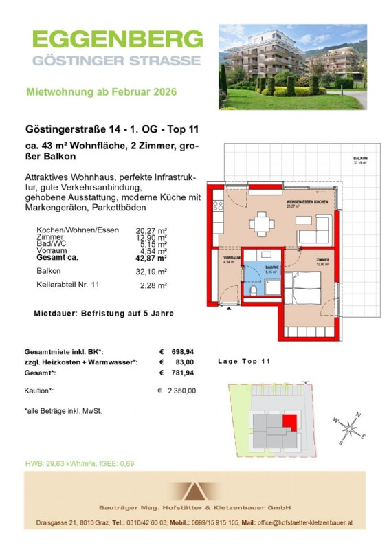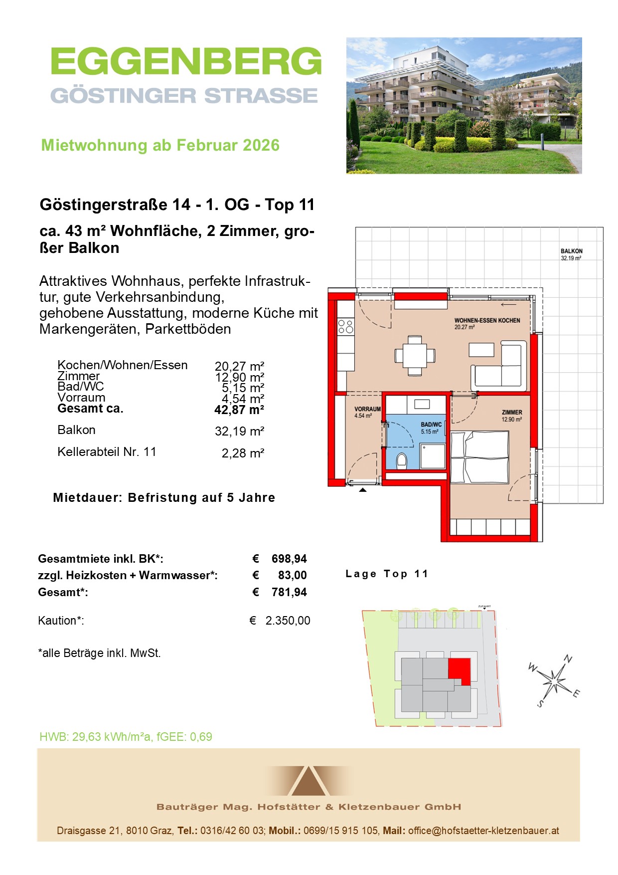 Sie schätzen gehobene Ausstattung, den Flair einer kleineren Wohnanlage und die Nähe zur Natur, lassen den Abend gerne auf dem Balkon oder bei einem schönen Spaziergang rund um Schloss Eggenberg ausklingen? Dann wird Ihnen diese Wohnung gefallen!